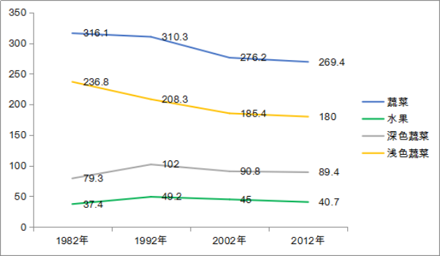 1982-2012年间我国居民蔬菜水果消费量(克/标准人日)的变化